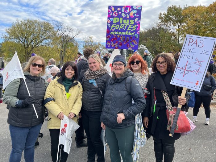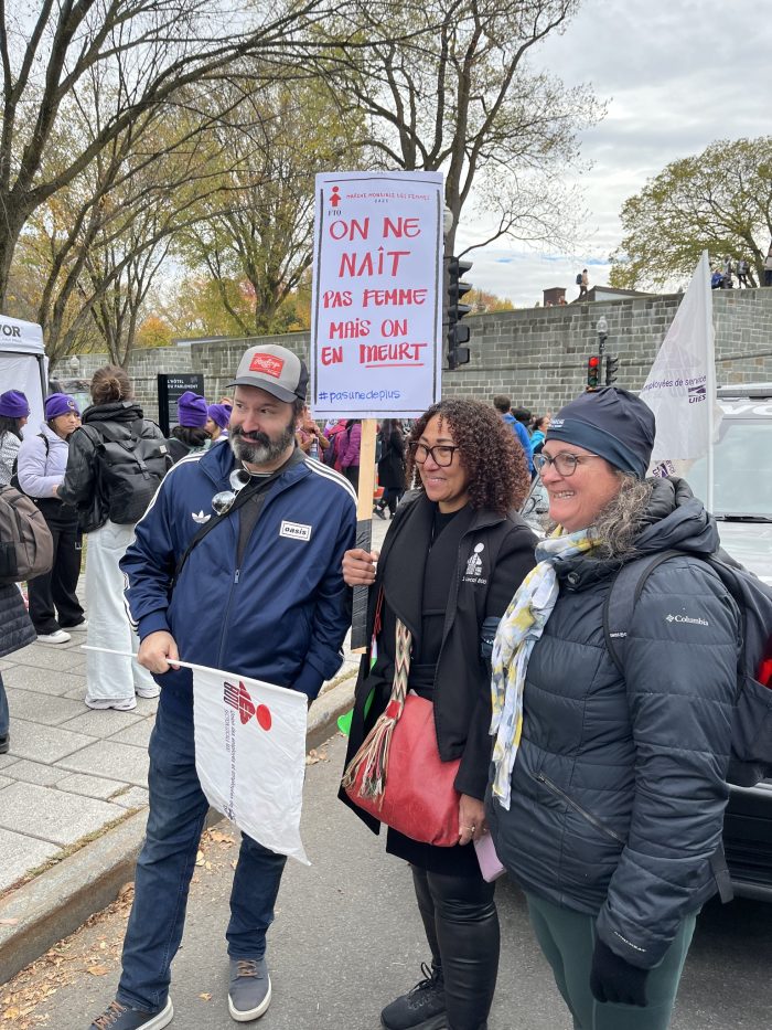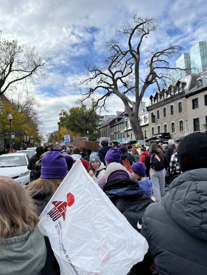 Trente ans après la marche historique Du pain et des roses, le cœur battant du mouvement féministe s’est remis à battre dans les rues de Québec. Parmi les quelque 16 000 participantes, on retrouvait des militantes, des travailleuses, des étudiantes, des mères, des alliées et une délégation fière et unie du 800, drapeaux et pancartes à la main.